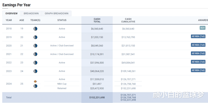 东契奇前7个赛季的薪水合计是1.522亿,下赛季东契奇薪资位4599万,算上这份新合同3年1.653亿,那么东契奇的总薪资会达到3.64亿(小数点后只取了两位),注意这里要东契奇拿够三年1.653亿才能进入前25(排24),但他2028年夏跳出合同与湖人重签合同后这个排名会迎来暴涨。