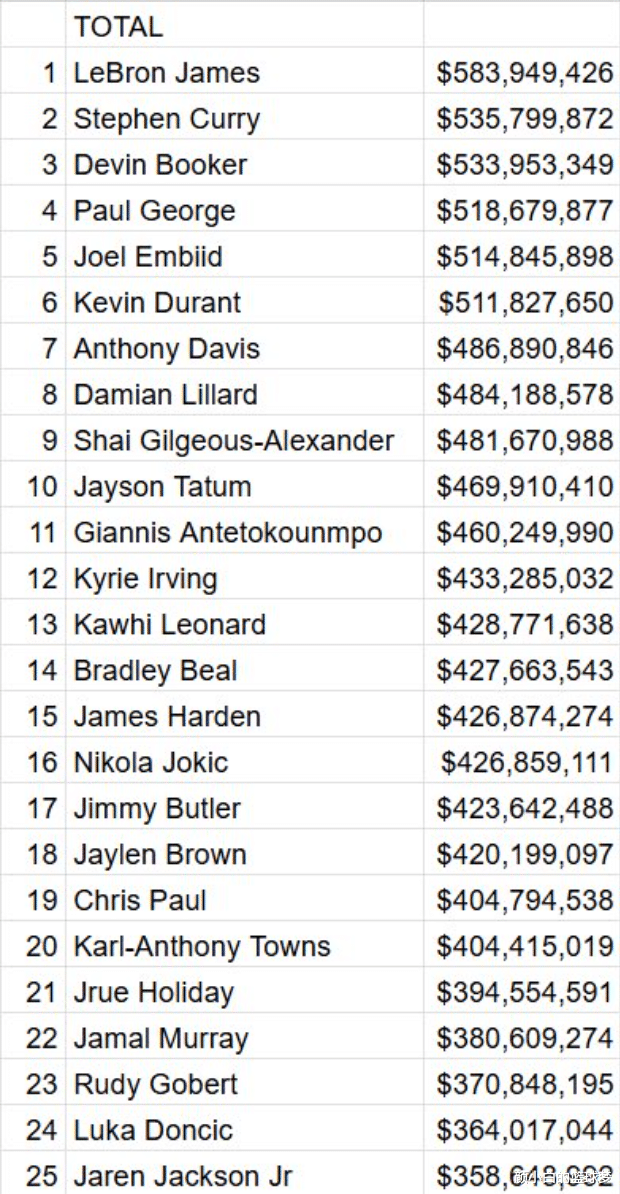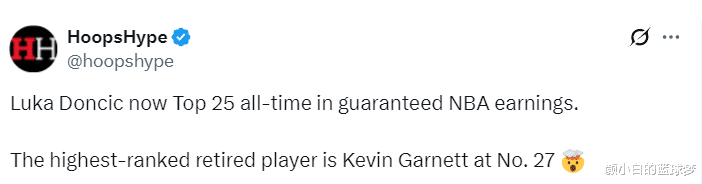 美媒HoopsHype写道:东契奇与湖人达成这份提前续约后,他在NBA的总薪资也仅仅进入历史前25而已,退役球员中凯文-加内特的总薪资排在第27位。